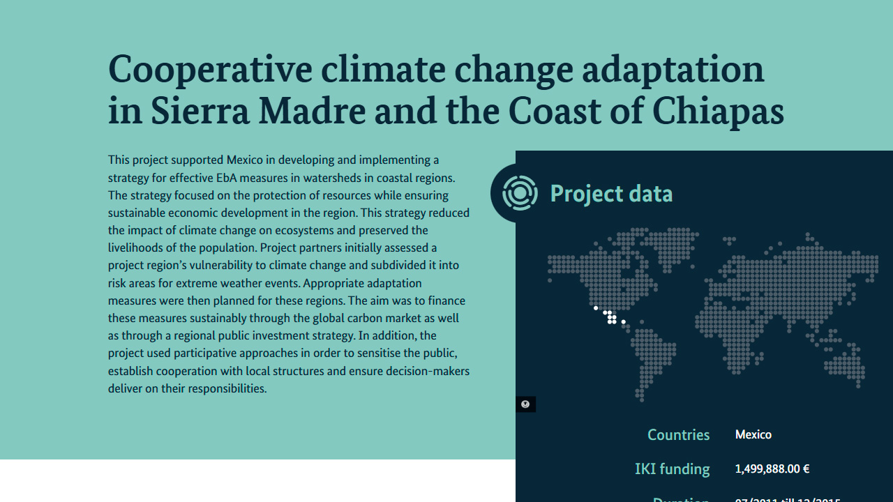 El proyecto impulsó el diseño y la puesta en marcha de una estrategia de Adaptación basada en Ecosistemas (AbE) en cuencas hidrográficas de regiones costeras. La estrategia priorizó la protección de los recursos naturales, garantizando al mismo tiempo, el desarrollo económico sostenible de la región. Los socios del proyecto evaluaron la vulnerabilidad de la región al cambio climático y la subdividieron en zonas de riesgo ante fenómenos meteorológicos extremos. Con base en ese diagnóstico, planificaron e implementaron medidas de adaptación adecuadas para cada zona. Como resultado, se redujo el impacto del cambio climático sobre los ecosistemas, preservando los medios de vida de la población.