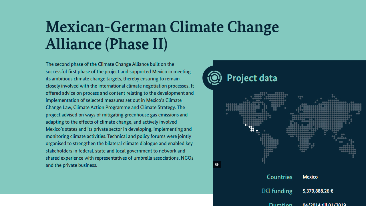 La segunda fase de la Alianza Mexicana – Alemana de Cambio Climático impulsó el cumplimiento de los ambiciosos objetivos en materia de cambio climático en México, garantizando así su estrecha participación en los procesos internacionales de negociación sobre el clima. Ofreció asesoramiento para el desarrollo y la aplicación de medidas establecidas en la Ley de Cambio Climático, el Programa de Acción Climática y la Estrategia Climática del país. Asimismo, brindó orientación sobre las acciones para mitigar las emisiones de gases de efecto invernadero y adaptarse a los efectos del cambio climático, e involucró activamente a los estados y al sector privado en el desarrollo, la implementación y el seguimiento de las actividades climáticas.