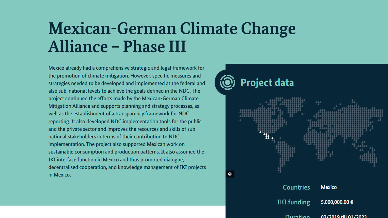 La Alianza Mexicana-Alemana de Cambio Climático apoya en la interconexión de los proyectos del portafolio de la Iniciativa Internacional de Protección del Clima (IKI) en México. Se apoya a 32 proyectos de 21 organizaciones implementadores y se fomenta el intercambio y la comunicación de la red de los proyectos IKI, a través de la página de conocimiento IKI Alliance México, y un boletín trimestral sobre temáticas clave de la cooperación, así como talleres anuales de intercambio entre proyectos IKI y espacios de diálogo político de alto nivel entre México y Alemania.