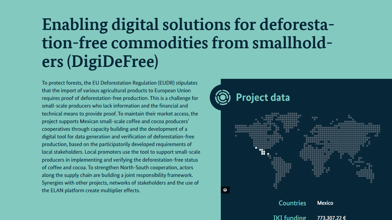 Para proteger los bosques, la Regulación de la Deforestación de la UE (EUDR) estipula que la importación de varios productos agrícolas a la Unión Europea requiere prueba de producción libre de deforestación. Este es un desafío para los productores a pequeña escala que carecen de información y los medios financieros y técnicos para proporcionar pruebas. Para mantener el acceso al mercado, el proyecto respalda las cooperativas mexicanas de los productores de café y cacao a través del desarrollo de capacidades y el desarrollo de una herramienta digital para la generación de datos y la verificación de la producción libre de deforestación, basada en los requisitos participativamente desarrollados de las partes interesadas locales. Los promotores locales utilizan la herramienta para admitir productores a pequeña escala en la implementación y verificación del estado sin deforestación del café y el cacao. Para fortalecer la cooperación norte-sur, los actores a lo largo de la cadena de suministro están construyendo un marco de responsabilidad conjunta. Sinergias con otros proyectos, redes de partes interesadas y el uso de la plataforma ELAN crean multiplicador efectos.