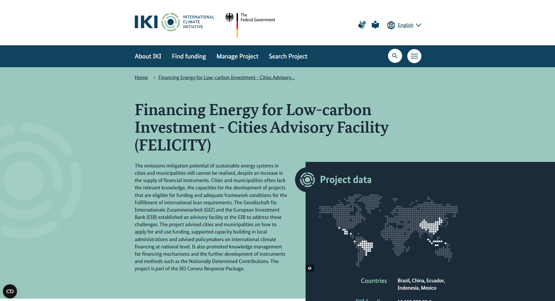 La Gesellschaft für Internationale Zusammenarbeit (GIZ), GmbH y el Banco Europeo de Inversiones (EIB) establecieron un mecanismo consultivo sobre ciudades para apoyar la preparación de proyectos sostenibles de infraestructura amigable con el clima para realizar su potencial de reducción de emisiones en los sectores de la energía, el transporte, los residuos y el agua. El proyecto “Financiamiento de Infraestructura baja en carbono en las ciudades» (FELICITY), cierra la brecha entre la planificación del desarrollo urbano y la financiación de proyectos de infraestructura proporcionando apoyo personalizado a intermediarios financieros y ciudades para que sus proyectos de infraestructura con bajas emisiones de carbono sean financiables a través de los préstamos concedidos por el EIB.