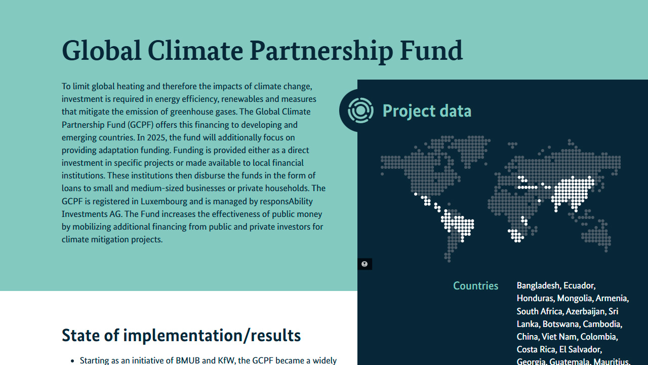 Para limitar el calentamiento global y, por lo tanto, los impactos del cambio climático, se requiere inversión en la eficiencia energética, las energías renovables y las medidas que mitigan la emisión de gases de efecto invernadero. El Fondo Global de Asociación Climática (GCPF) ofrece este financiamiento a los países en desarrollo y emergentes. En 2025, el Fondo también se centrará en proporcionar fondos de adaptación. La financiación se proporciona como una inversión directa en proyectos específicos o se pone a disposición de las instituciones financieras locales. Luego, estas instituciones gestionan los fondos en forma de préstamos a pequeñas y medianas empresas o hogares privados. El GCPF está registrado en Luxemburgo y se gestiona por inversiones de responsabilidad AG. El fondo aumenta la efectividad del dinero público al movilizar el financiamiento adicional de los inversores públicos y privados para proyectos de mitigación climática.