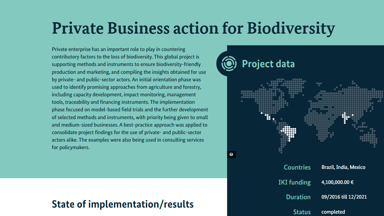 Las empresas pueden hacer una contribución significativa a revertir las causas de la pérdida de biodiversidad. Durante la última década, la inversión del sector privado en la protección de la diversidad biológica ha aumentado constantemente. El objetivo del proyecto es identificar, comprender, sistematizar y elaborar enfoques de financiación existentes (mecanismos e instrumentos) para promover la producción amigable con la biodiversidad y la comercialización. Como parte de la estrategia del proyecto, el financiamiento debe ser creado como un modelo en tres países participantes. Se identifican, analizan y sistematizan abordajes prometedores así como experiencias, iniciativas, mecanismos, instrumentos y necesidades del sector privado existentes en determinados sectores económicos (en particular en la agricultura, el turismo, la artesanía, la pesca, los alimentos). Basándose en una fase exploratoria (hasta 18 meses después del inicio del proyecto), la estrategia del proyecto debe seguir desarrollándose en cooperación con los países participantes. En los tres países participantes se seleccionan y ensayan iniciativas prometedoras para promover la producción y comercialización amigable con la diversidad.