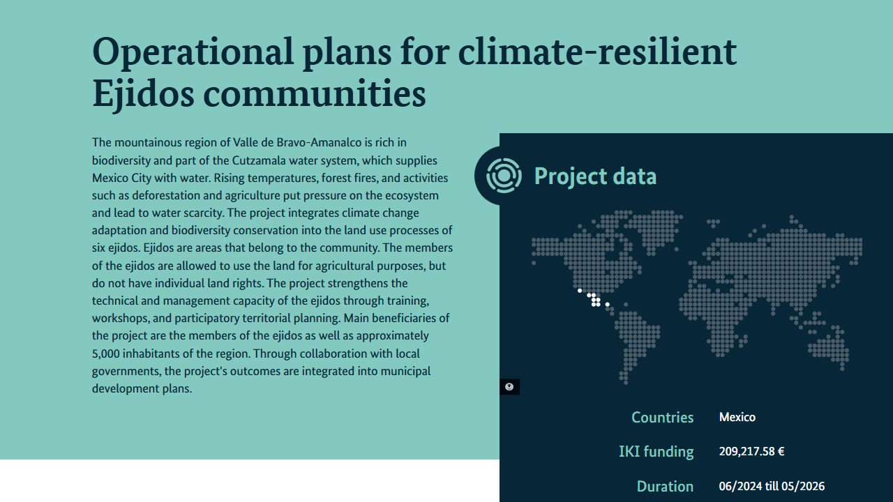 La región montañosa de Valle de Bravo-Amanalco es rica en biodiversidad y parte del sistema de agua Cutzamala, que suministra agua a la Ciudad de México. El aumento de las temperaturas, los incendios forestales y las actividades como la deforestación y la agricultura ejercen presión sobre el ecosistema y conducen a la escasez de agua. El proyecto integra la adaptación del cambio climático y la conservación de la biodiversidad en los procesos de uso de la tierra de seis Ejidos. Los ejidos son áreas que pertenecen a la comunidad. Los miembros de los Ejidos pueden usar la tierra con fines agrícolas, pero no tienen derechos de tierra individuales. El proyecto fortalece la capacidad técnica y de gestión de los Ejidos a través de capacitación, talleres y planificación territorial participativa. Los principales beneficiarios del proyecto son los miembros de los Ejidos, así como aproximadamente 5,000 habitantes de la región. A través de la colaboración con los gobiernos locales, los resultados del proyecto se integran en los planes de desarrollo municipal