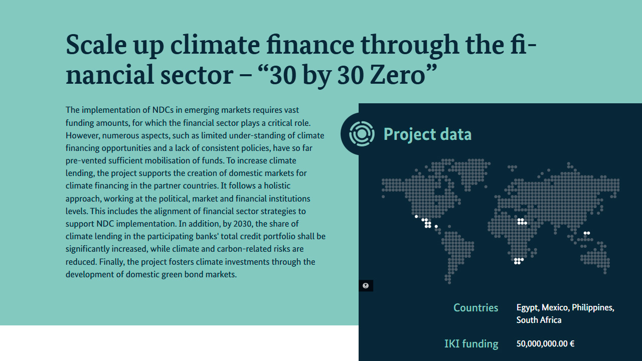 La implementación de NDC en los mercados emergentes requiere grandes cantidades de financiación, para las cuales el sector financiero juega un papel fundamental. Sin embargo, numerosos aspectos, como la subvención limitada de las oportunidades de financiamiento climático y la falta de políticas consistentes, hasta ahora tienen una movilización suficiente de fondos. Para aumentar los préstamos climáticos, el proyecto respalda la creación de mercados nacionales para el financiamiento climático en los países asociados. Sigue un enfoque holístico, trabajando a nivel de instituciones políticas, de mercado y financieras. Esto incluye la alineación de las estrategias del sector financiero para apoyar la implementación de NDC. Además, para 2030, la participación de los préstamos climáticos en la cartera de crédito total de los bancos participantes aumentará significativamente, mientras que los riesgos climáticos y relacionados con el carbono se reducen. Finalmente, el proyecto fomenta las inversiones climáticas a través del desarrollo de los mercados nacionales de bonos verdes