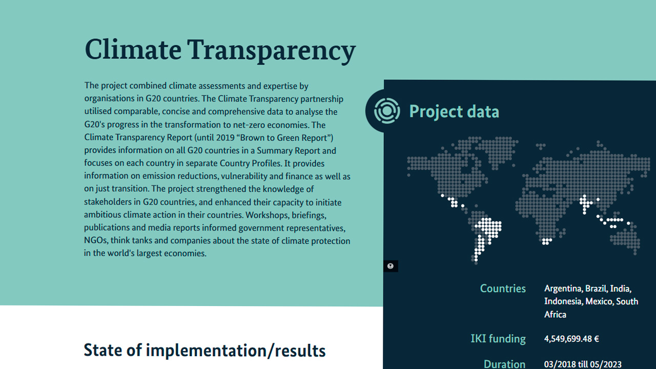 La Transparencia Climática reúne las evaluaciones climáticas más autorizadas y la experiencia de instituciones de países del G20. Conjuntamente, estos expertos desarrollan una imagen fiable, integral y comparable sobre el desempeño climático de los países del G20: el informe anual Brown to Green incluye información fácil de usar sobre mitigación, vulnerabilidad y finanzas. Según el informe, el proyecto IKI se esfuerza por mejorar el conocimiento de los actores clave sobre el desempeño climático del G20 y, por consiguiente, reitera su disposición para impulsar una acción climática más ambiciosa en Argentina, Brasil, China, India, Indonesia, México y Sudáfrica. Los talleres, las sesiones informativas, los productos de conocimiento específicos y el trabajo en los medios de comunicación brindan información vital a los representantes del gobierno, en particular a los expertos y ministerios de finanzas, las partes interesadas del G20, las ONG, los grupos de expertos y las empresas.