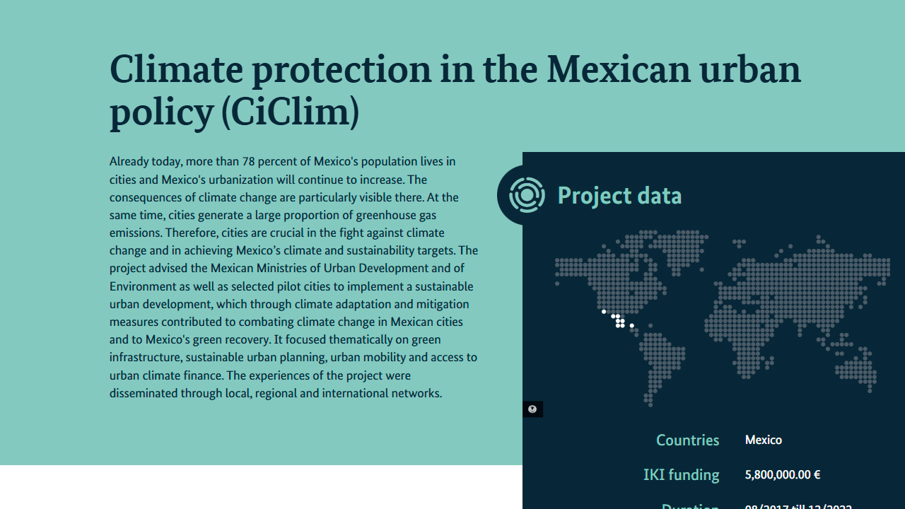La Deutsche Gesellschaft für Internationale Zusammenarbeit (GIZ) GmbH (Cooperación Alemana al Desarrollo Sustentable) busca con el Programa Protección del Clima en la Política Urbana de México (CiClim) mejorar la planeación de las ciudades mexicanas. El programa se ejecuta por encargo del Ministerio Federal de Medio Ambiente, Protección de la Naturaleza y Seguridad Nuclear (BMU) como parte de la Iniciativa Internacional de Protección del Clima (IKI).