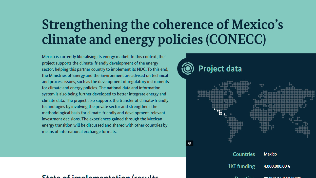 La articulación entre las políticas climáticas y energéticas en el ámbito nacional mejora si se aplican medidas estratégicas. Además, el proyecto fomenta el desarrollo de instrumentos regulatorios e incentivos económicos para promover la convergencia de la política climática y energética. Por otro lado, se mejoran los sistemas nacionales de información para lograr una mayor integración de datos y variables energéticas y climáticas. Este proyecto facilita la creación de condiciones marco mejoradas para promover inversiones que favorezcan el desarrollo y la protección del clima en México desde el sector energético. El conjunto de experiencias recabadas en México es objeto de debate en el marco de un diálogo con personas expertas en el ámbito internacional y los conocimientos y experiencias adquiridas se comparten con otros países. Se incluye también al sector privado para promover la transferencia de tecnologías de protección del clima en relación al sector energía.