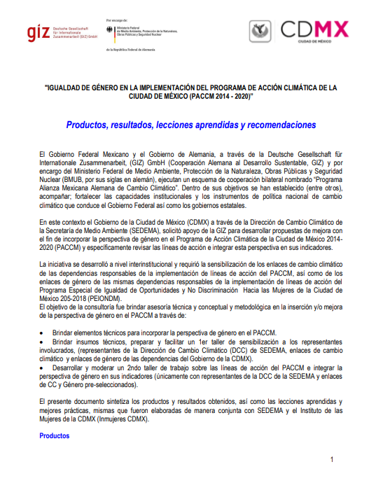 Reporte ejecutivo: «IGUALDAD DE GÉNERO EN LA IMPLEMENTACIÓN DEL PROGRAMA DE ACCIÓN CLIMÁTICA DE LA CIUDAD DE MÉXICO (PACCM 2014 – 2020)”