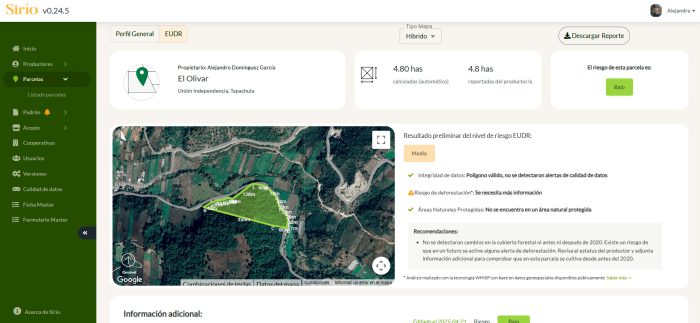 El sistema otorga a las cooperativas la propiedad y el control de sus datos, permitiéndoles realizar análisis de riesgo y tomar decisiones informadas para mitigar posibles incumplimientos. De esta forma, pueden recopilar documentación adicional y responder con mayor solidez a los procesos de debida diligencia requeridos por sus clientes. Sirio está por liberar la segunda parte del módulo EUDR, centrada en la trazabilidad de los productos, que permitirá visualizar el nivel de riesgo de los productores durante el acopio. La primera parte del módulo, dedicada al análisis de no deforestación y estatus legal, ya está disponible y está siendo utilizada por varias organizaciones en México.