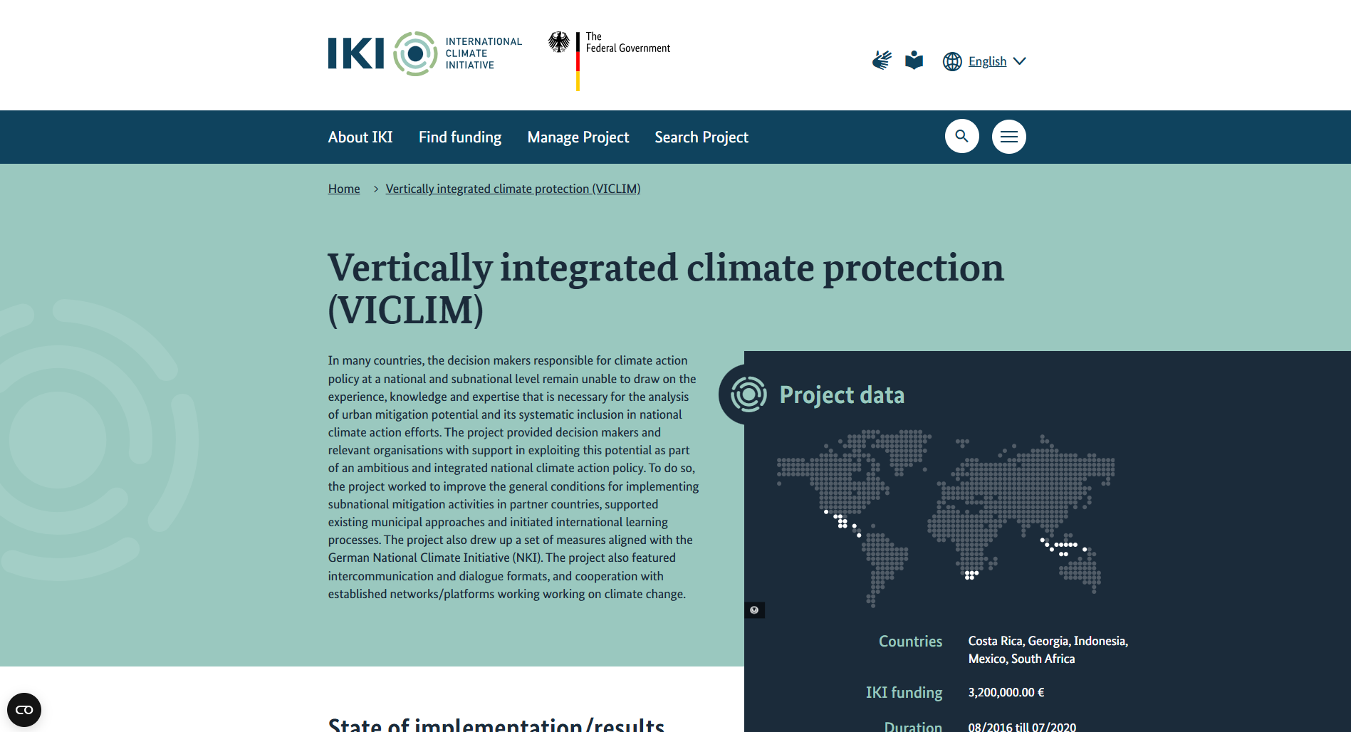 VICLIM es financiado por la Iniciativa Internacional de Protección del Clima (IKI por sus siglas en alemán) del Ministerio Federal de Medio Ambiente, Protección de la Naturaleza y Seguridad Nuclear (BMU) de Alemania y es ejecutado por la Deutsche Gesellschaft für Internationale Zusammenarbeit (GIZ) GmbH. En el caso de México, la contraparte es la Dirección General de Cambio Climático (DGPCC) de la Secretaría de Medio Ambiente y Recursos Naturales Semarnat (SEMARNAT).